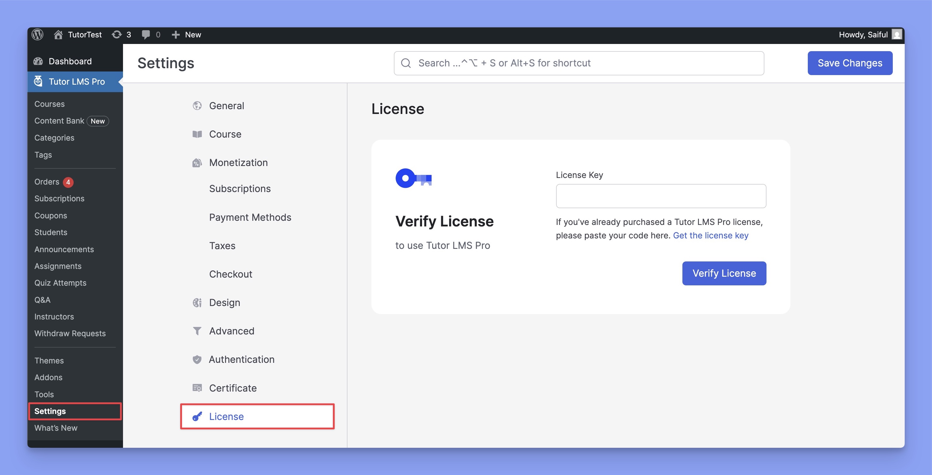 To insert your license key (which can be found in your Tutor LMS dashboard), navigate to Tutor LMS Pro > License, enter the license key in the text field, and then click on the “Verify License” button.
